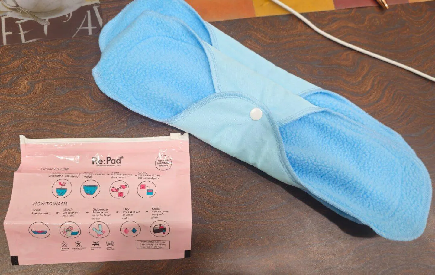 To wear a reusable sanitary pad, position the pad on your underwear and secure it with the snap buttons that are on your pad. And wear it like you usually do.